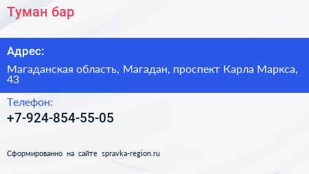 Туман, бар по адресу Магаданская область, Магадан, проспект Карла Маркса, 43 в дальнейшем Организация, размещена в следующих категориях: