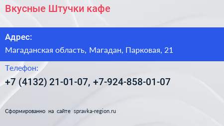 Вкусные Штучки, кафе по адресу Магаданская область, Магадан, Парковая, 21 в дальнейшем Организация, размещена в следующих категориях: