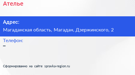 Ателье по адресу Магаданская область, Магадан, Дзержинского, 2 в дальнейшем Организация, размещена в следующих категориях: