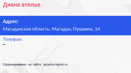Диана, ателье по адресу Магаданская область, Магадан, Пушкина, 14 в дальнейшем Организация, размещена в следующих категориях: