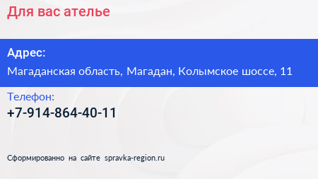 Для вас, ателье по адресу Магаданская область, Магадан, Колымское шоссе, 11 в дальнейшем Организация, размещена в следующих категориях: