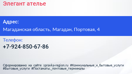 Элегант, ателье по адресу Магаданская область, Магадан, Портовая, 4 в дальнейшем Организация, размещена в следующих категориях: