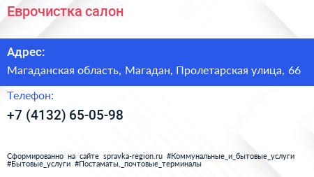 Еврочистка, салон по адресу Магаданская область, Магадан, Пролетарская улица, 66 в дальнейшем Организация, размещена в следующих категориях: