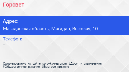 Горсвет по адресу Магаданская область, Магадан, Высокая, 10 в дальнейшем Организация, размещена в следующих категориях: