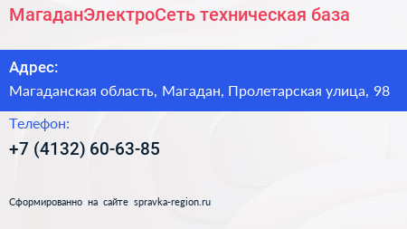 МагаданЭлектроСеть, техническая база по адресу Магаданская область, Магадан, Пролетарская улица, 98 в дальнейшем Организация, размещена в следующих категориях: