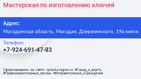 Мастерская по изготовлению ключей по адресу Магаданская область, Магадан, Дзержинского, 19а киоск в дальнейшем Организация, размещена в следующих категориях: