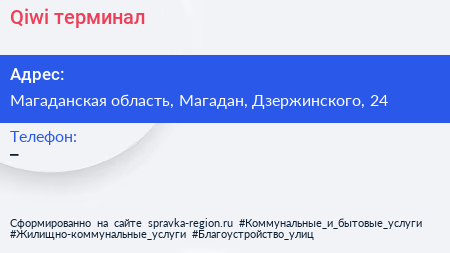 Qiwi, терминал по адресу Магаданская область, Магадан, Дзержинского, 24 в дальнейшем Организация, размещена в следующих категориях: