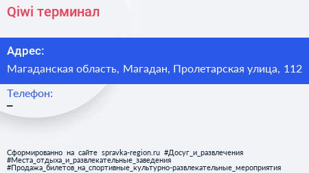 Qiwi, терминал по адресу Магаданская область, Магадан, Пролетарская улица, 112 в дальнейшем Организация, размещена в следующих категориях: