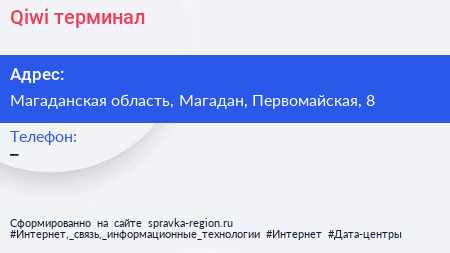 Qiwi, терминал по адресу Магаданская область, Магадан, Первомайская, 8 в дальнейшем Организация, размещена в следующих категориях: