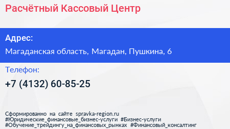Расчётный Кассовый Центр по адресу Магаданская область, Магадан, Пушкина, 6 в дальнейшем Организация, размещена в следующих категориях: