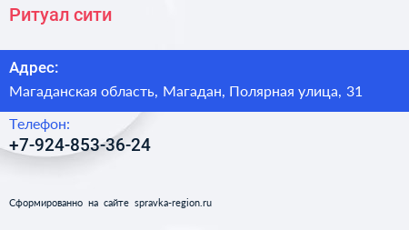 Ритуал-сити по адресу Магаданская область, Магадан, Полярная улица, 31 в дальнейшем Организация, размещена в следующих категориях: