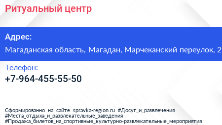 Ритуальный центр по адресу Магаданская область, Магадан, Марчеканский переулок, 2 в дальнейшем Организация, размещена в следующих категориях: