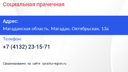 Социальная прачечная по адресу Магаданская область, Магадан, Октябрьская, 13а в дальнейшем Организация, размещена в следующих категориях: