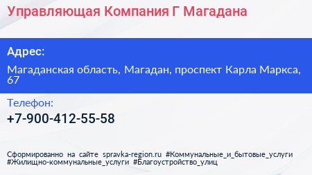 Управляющая Компания Г. Магадана по адресу Магаданская область, Магадан, проспект Карла Маркса, 67 в дальнейшем Организация, размещена в следующих категориях: