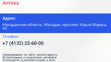 Аптека по адресу Магаданская область, Магадан, проспект Карла Маркса, 65 в дальнейшем Организация, размещена в следующих категориях: