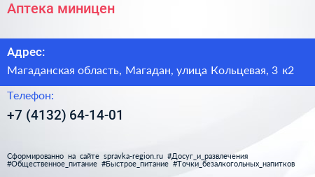 Аптека миницен по адресу Магаданская область, Магадан, улица Кольцевая, 3 к2 в дальнейшем Организация, размещена в следующих категориях: