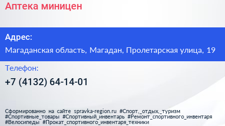 Аптека миницен по адресу Магаданская область, Магадан, Пролетарская улица, 19 в дальнейшем Организация, размещена в следующих категориях:
