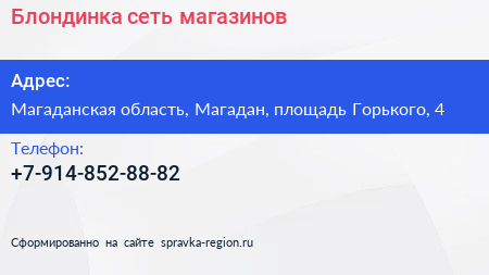 Блондинка, сеть магазинов по адресу Магаданская область, Магадан, площадь Горького, 4 в дальнейшем Организация, размещена в следующих категориях: