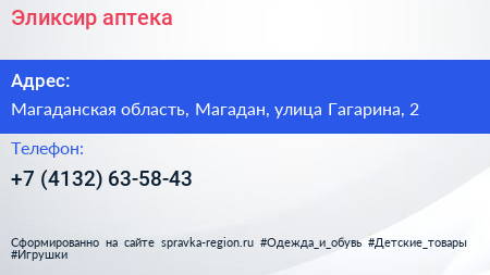 Эликсир, аптека по адресу Магаданская область, Магадан, улица Гагарина, 2 в дальнейшем Организация, размещена в следующих категориях: