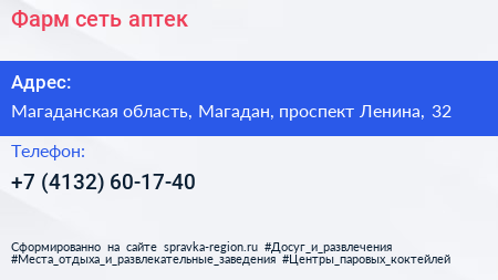 Фарм, сеть аптек по адресу Магаданская область, Магадан, проспект Ленина, 32 в дальнейшем Организация, размещена в следующих категориях: