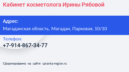 Кабинет косметолога Ирины Рябовой по адресу Магаданская область, Магадан, Парковая, 10/10 в дальнейшем Организация, размещена в следующих категориях:
