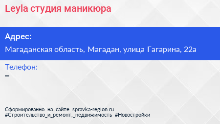 Leyla, студия маникюра по адресу Магаданская область, Магадан, улица Гагарина, 22а в дальнейшем Организация, размещена в следующих категориях:
