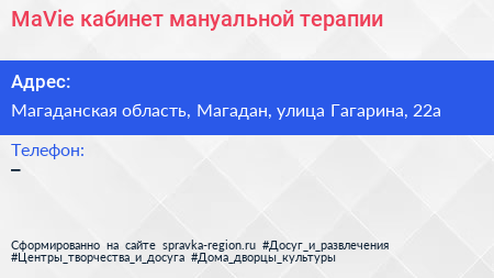 MaVie, кабинет мануальной терапии по адресу Магаданская область, Магадан, улица Гагарина, 22а в дальнейшем Организация, размещена в следующих категориях: