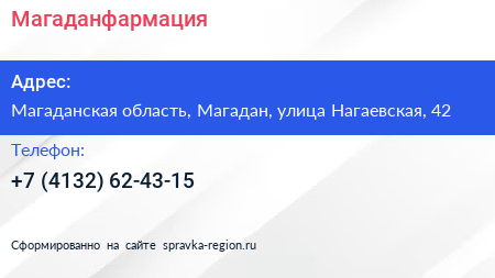 Магаданфармация по адресу Магаданская область, Магадан, улица Нагаевская, 42 в дальнейшем Организация, размещена в следующих категориях: