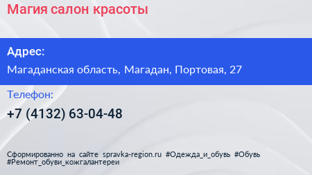 Магия, салон красоты по адресу Магаданская область, Магадан, Портовая, 27 в дальнейшем Организация, размещена в следующих категориях: