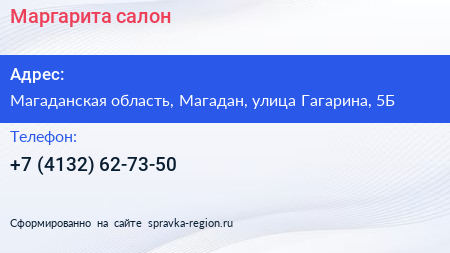Маргарита, салон по адресу Магаданская область, Магадан, улица Гагарина, 5Б в дальнейшем Организация, размещена в следующих категориях: