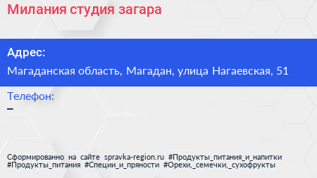Милания, студия загара по адресу Магаданская область, Магадан, улица Нагаевская, 51 в дальнейшем Организация, размещена в следующих категориях: