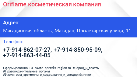 Oriflame, косметическая компания по адресу Магаданская область, Магадан, Пролетарская улица, 11 в дальнейшем Организация, размещена в следующих категориях: