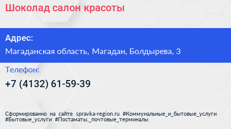 Шоколад, салон красоты по адресу Магаданская область, Магадан, Болдырева, 3 в дальнейшем Организация, размещена в следующих категориях: