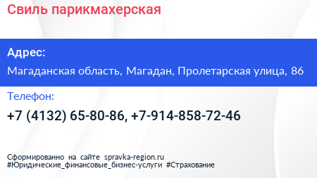 Свиль, парикмахерская по адресу Магаданская область, Магадан, Пролетарская улица, 86 в дальнейшем Организация, размещена в следующих категориях: