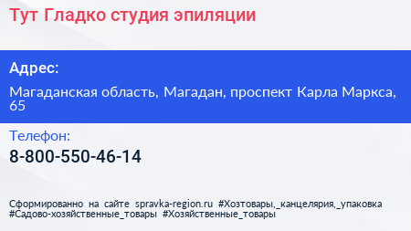 Тут Гладко, студия эпиляции по адресу Магаданская область, Магадан, проспект Карла Маркса, 65 в дальнейшем Организация, размещена в следующих категориях: