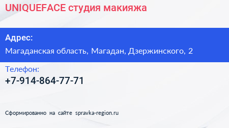 UNIQUEFACE, студия макияжа по адресу Магаданская область, Магадан, Дзержинского, 2 в дальнейшем Организация, размещена в следующих категориях: