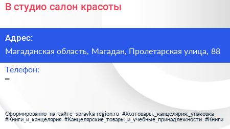 В студио, салон красоты по адресу Магаданская область, Магадан, Пролетарская улица, 88 в дальнейшем Организация, размещена в следующих категориях: