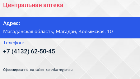 Центральная аптека по адресу Магаданская область, Магадан, Колымская, 10 в дальнейшем Организация, размещена в следующих категориях: