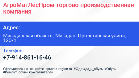 АгроМагЛесПром, торгово-производственная компания по адресу Магаданская область, Магадан, Пролетарская улица, 120/1 в дальнейшем Организация, размещена в следующих категориях: