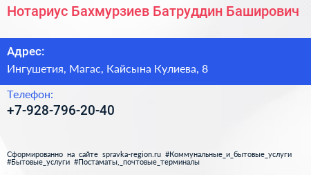 Нотариус Бахмурзиев Батруддин Баширович по адресу Ингушетия, Магас, Кайсына Кулиева, 8 в дальнейшем Организация, размещена в следующих категориях: