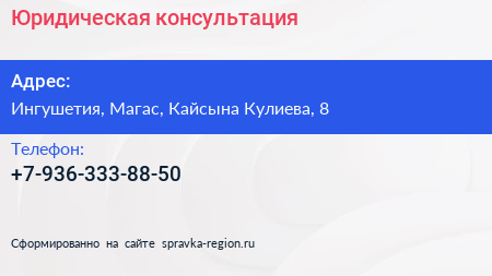Юридическая консультация по адресу Ингушетия, Магас, Кайсына Кулиева, 8 в дальнейшем Организация, размещена в следующих категориях: