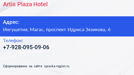 Artis Plaza Hotel по адресу Ингушетия, Магас, проспект Идриса Зязикова, 6 в дальнейшем Организация, размещена в следующих категориях: