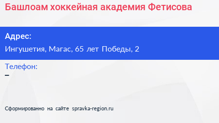 Башлоам, хоккейная академия Фетисова по адресу Ингушетия, Магас, 65 лет Победы, 2 в дальнейшем Организация, размещена в следующих категориях:
