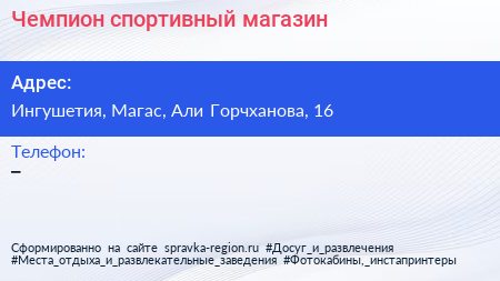 Чемпион, спортивный магазин по адресу Ингушетия, Магас, Али Горчханова, 16 в дальнейшем Организация, размещена в следующих категориях: