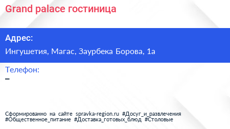Grand palace, гостиница по адресу Ингушетия, Магас, Заурбека Борова, 1а в дальнейшем Организация, размещена в следующих категориях:
