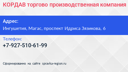 КОРДАВ, торгово-производственная компания по адресу Ингушетия, Магас, проспект Идриса Зязикова, 6 в дальнейшем Организация, размещена в следующих категориях: