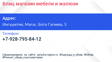 Блиц, магазин мебели и жалюзи по адресу Ингушетия, Магас, Бота Гагиева, 5 в дальнейшем Организация, размещена в следующих категориях: