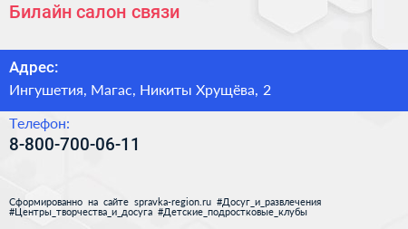 Билайн, салон связи по адресу Ингушетия, Магас, Никиты Хрущёва, 2 в дальнейшем Организация, размещена в следующих категориях: