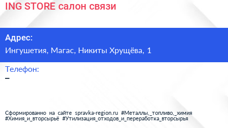 ING STORE, салон связи по адресу Ингушетия, Магас, Никиты Хрущёва, 1 в дальнейшем Организация, размещена в следующих категориях: