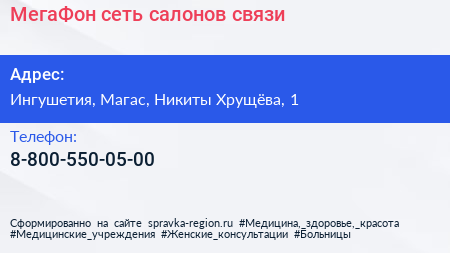 МегаФон, сеть салонов связи по адресу Ингушетия, Магас, Никиты Хрущёва, 1 в дальнейшем Организация, размещена в следующих категориях: